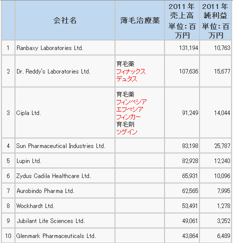 フィナステリド、ミノキシジルは>>>海外育毛薬の比較を参考にして下さい。 各インド製ジェネリックは多種類販売されてますが各フィナステリドでの効果が個々で違うという報告がありますのでキノリンイエローの関係で服用中のフィンペシアから変更する人も増えてますがそのあたりは十分注意して下さい。 *2012年7月末から、フィンペシアのコーティング剤に日本では、不許可添加物の着色料キノリンイエローが使用されてますが日本の場合は国際的にも非常に厳しい基準を持っているために他国では問題ない添加物や着色料が日本では禁止されています。 インド製薬会社ランキング ![]() 単位: 1インド・ルピー = 1.42円で換算