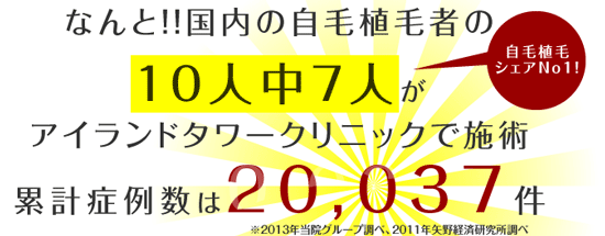 アイランドタワークリニック ![]() 今、世界で注目されてる根本的な薄毛解消方法! それは、最新の医療技術で自分の髪の毛を自分に移植するアイランドタワークリニック独自の「自毛植毛」です! 国内で唯一メスを使わない、切らない手術が出来ます。