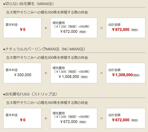 ![]() 親和クリニック ![]() 約30000症例を超す実績を持つ医師が集結!自毛植毛のトップシェアクリニックを牽引してきた医師が「理想」とする薄毛治療専門のクリニックを開院しました! 自毛植毛のトップクラスの症例数を誇る医師がたどり着いた先進的自毛植毛:MIRAI法が誕生。 メスを一切使用しないので切らずに、痛みが最小限で術後に腫れることもありません。 施術自体も短時間で1回の施術で植毛が完了します。自然で繊細なヘアデザインを可能にし、熟練の技術力で他院では断られる場合もある頭頂部の植毛も100%可能です。高密度かつ大量移植可能な新たな自毛植毛技術です。 ![]() ※上記は特別プラン期間中の料金となります。 ※表示されている費用は、全て税抜きの価格です。 ※男性・女性ともに同一料金です。