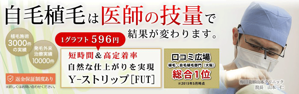 自毛植毛クリニック 関西エリア限られた期間内で髪を増やす方法として、本来は「かつら」や「増毛」ということになりますが、これら以外の方法として美容外科や形成外科などの医師が行う「毛髪移植植毛術(自毛植毛)」があります。 生え際・M字などへ自毛植毛を受ける人が年々増加 女性への自毛植毛が年々増加中2009年のアメリカのデータでは、自毛植毛クリニックを訪ねる男女比は7対3、つまり植毛の患者さんの約3割は女性で、その内訳は、女性のAGA(女性型脱毛症)が70%、びまん性脱毛が11%、円形脱毛症が10%、その他10%程度です。 また、2004年のデータでは、女性への自毛植毛は全体の11.4%でしたが、2008年では15.1%に跳ね上がっています。 自毛植毛クリニック選びのポイント確かな技術・経験を持つ医師がいる自毛植毛手術の仕上がりは執刀する医師の経験と技量が大きく関わってきます。自分の手術を担当する医師が信頼できるかどうか、クリニックのホームページで経歴を確認したり、実際に会って親身に話を聞いてくれるかどうかを確認すると良いでしょう。 看護師やスタッフが自毛植毛の知識に習熟している 医師だけでなく看護師やスタッフの質も重要な要素です。 術前・術後の様々な質問に的確に答えてくれるか、患者の相談に親身に乗ってくれるかをカウンセリング時に確認してみましょう。 最新・最先端の医療技術・医療機器を有している 医療技術は日進月歩の世界です。目新しかった技術が1年後には時代遅れになることも珍しくありません。手術を検討しているクリニックが常に最新の医療技術や情報収集に取り組んでいるかどうかも大切なポイントです。 経験者の声が聞ける 薄毛の悩みはなかなか人に相談できるものではありません。また手術の実際の仕上がりがどのようなものであるかを知るためには実際に手術を受けた人の頭部を見るのが一番です。自らも薄毛に悩み、手術を実際に経験しているスタッフがいるクリニックであれば、より具体的で的確な相談ができるでしょう。 適切な価格表示をしている 自毛植毛は非常に高額な手術です。実際にどれくらいの費用がかかるのか、術後に追加費用が発生するのか等、後々のトラブルを避ける為にも、金額が具体的に明示されている良心的なクリニックを選びましょう。 アフターケアがしっかりしている 自毛植毛は後遺症の少ない手術ですが、予期しない症状が発生した場合の対処や、術後の疑問にしっかりと対応してくれるアフターケア体制が整っているかどうかもしっかり確認した方が良いでしょう。 自毛植毛クリニック 無料カウンセリング(男・女性)梅田美容山本クリニック 毛髪再生センター![]() 年々進化する”メスを使わない”自毛植毛<ユニカルFUE法を採用> 自毛植毛と言えば、これまで主流はメスで着るFUTでしたが、 最近はメスで切らないFUEが注目を集めており、今や植毛のスタンダードになりつつあります。 後頭部の皮膚を切除し、移植株を作るFUTに対し、FUEでは極めて細いパンチで毛髪周りの皮膚をくりぬいて移植株を作るのが特徴です。 もし生えなかったら全額返金保証! 長年の経験から多くの方の「髪の悩みを無くす」こと「生える喜びを実感」してもらうことの実績を積んできました。そこで私たちは長年の経験と実績から、その自信があるからこそ全額返金制度を導入致しました。 更に、遠方からお越しの方へ交通費・宿泊費を還元! 当クリニックが患者様の施術に必要な宿泊費を全額負担いたします。(大阪、兵庫、京都、奈良は適応外) 全国の患者様の新幹線、飛行機での交通費を当クリニックがご負担いたします。(大阪、兵庫、京都、奈良は適応外) ![]() 患者様のご要望やご予算に合わせて、オーダーメイド感覚で治療法をお選びいただくことができます。“自毛植毛”をはじめ、年齢や生活環境を考慮し、各種検査を行ってお一人おひとりに合わせた髪のお悩み解決法をご提案いたします。 また、患者様に無理のない各種お支払い方法をご用意。ご都合に合わせてお選びいただけます。